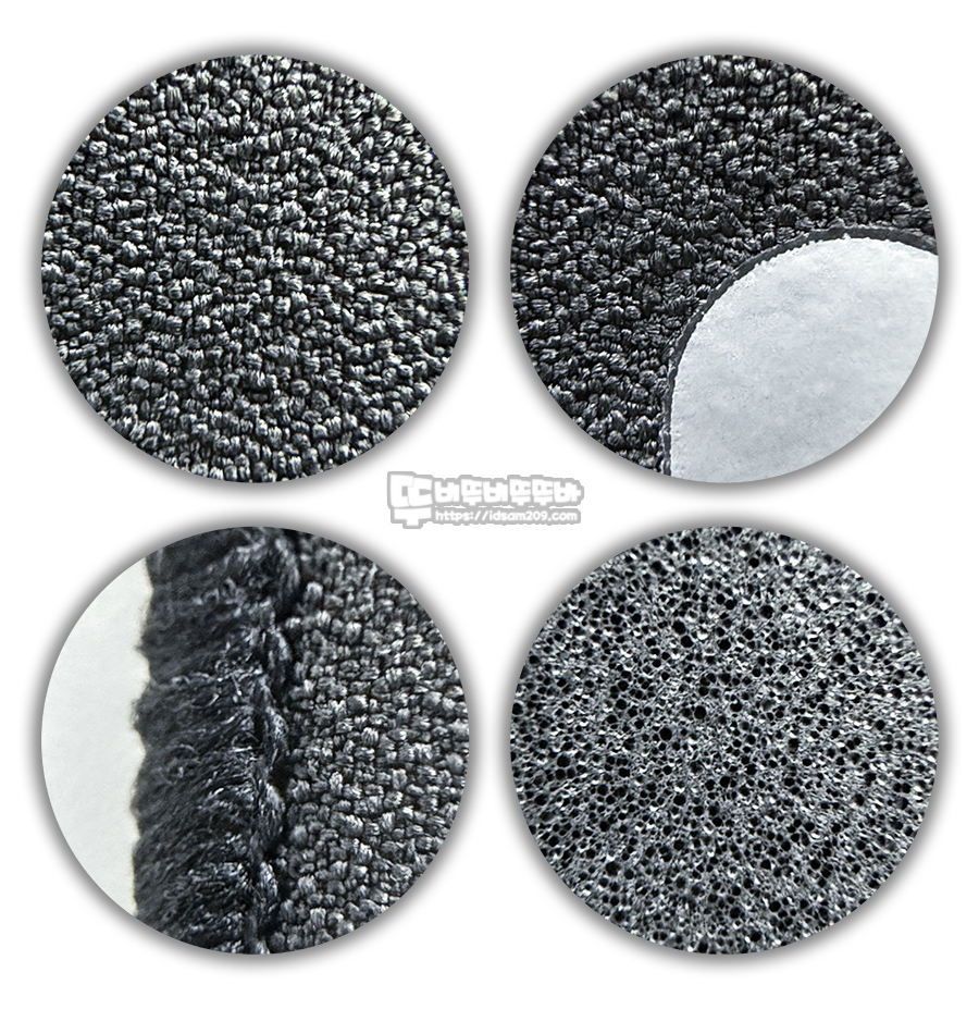 마우스 패드의 표면을 확대경으로 촬영해 보면 텍스쳐의 원사가 불규칙한 돌기로 표면이 고르지 않은 편이지만 X, Y 방향으로 움직이거나 회전을 하더라고 균일한 움직이며 네오프렌 폼 베이스는 확대했을 때 보이는 미세한 구멍 덕분에 패드를 눌렀을 때 약간의 쿠션감을 느낄 수 있었습니다.