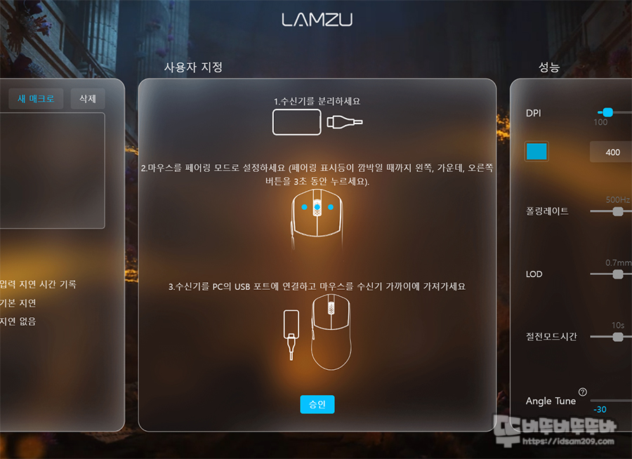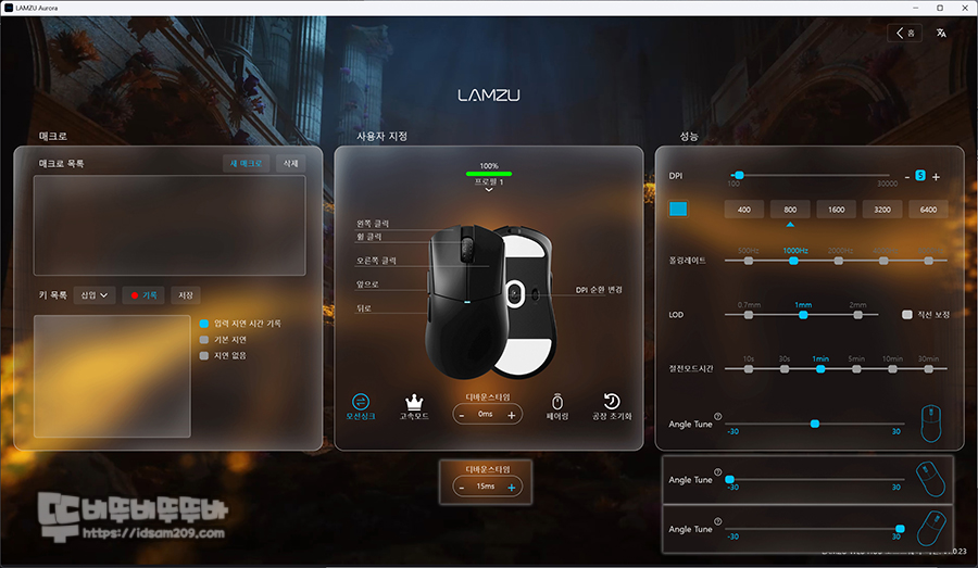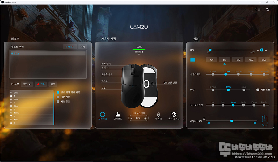 마우스를 클릭하여 메뉴로 접속 시 가장 왼쪽에는 매크로 메뉴 가운데에는 마우스 버튼 기능 및 모션 싱크, 고속모드, 디바운스 타임, 페어링, 공장 초기화 그리고 가장 오른쪽 메뉴에는 DPI 설정, 폴링 레이트, LOD, 절전모드 시간, 앵글 스냅핑 등의 기능을 설정할 수 있습니다.