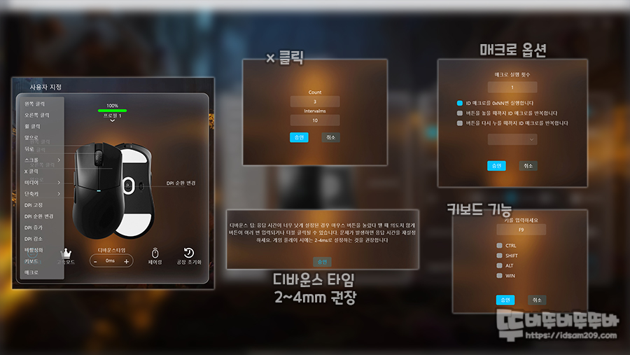 디바운스 타입의 경우 광 스위치기에 큰 의미는 없을 수 있지만 0 ~ 16ms를 지원하며 버튼 기능 설정 시 X 클릭 기능은 카운터 횟수와 인터벌 수치, 디바운스 타임의 경우 2~4mm 권장하는 메시지, 매크로 및 키보드 기능에서는 Ctrl, Alt, Shift, Win 조합의 모디키 단축키 지정이 가능합니다.