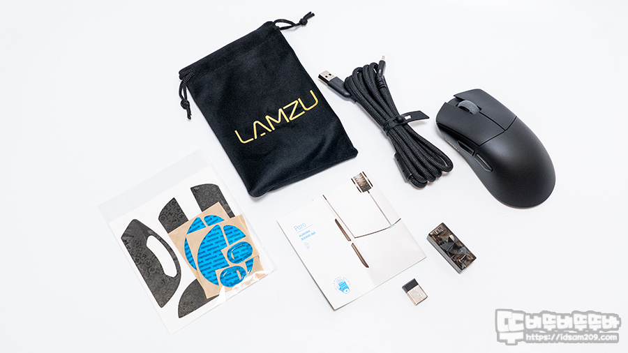 람주는 언박싱의 재미를 제공하는데 양쪽으로 펼쳐진 패키지 내부에 왼쪽에는 피트와 그립 테이프가 개별 포장된 비닐 그리고 케이블과 동글 익스텐드가 포함된 파우치가 담겨있으며 오른쪽에는 마우스와 1K 동글이 담겨있습니다.