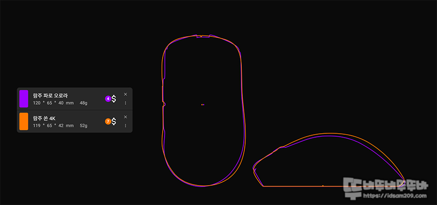 람주 쏜과 람푸 파로는 대략적으로 비슷한 크기지만 마우스 뒤쪽 부분의 경사도가 람주에 비해 급격히 떨어지는 디자인으로 팜 그립 또는 클로 그립 시 손바닥이 마우스 하우징 뒤쪽에 착 달라붙는 편안한 그립감을 제공합니다.