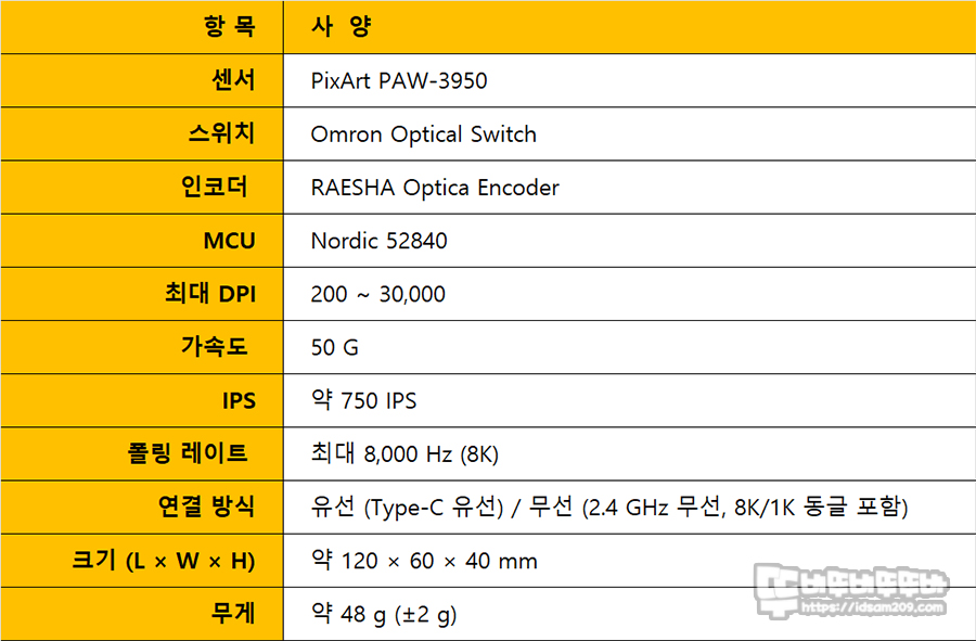 픽셀아트 3950 센서와 노르 52840 MCU 그리고 30,000 DPI 지원과 48g의 초경량 무게 그리고 Omron 광 스위치 및 RAESHA 광 엔코더를 사용한 게 특징이네요