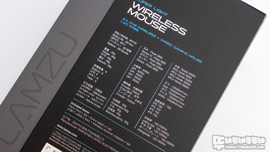 람주 마우스의 패키지는 블랙과 다크 그레이 톤으로 제품의 이미지와 모델명 그리고 제품의 다양한 특징을 잘 표현하고 있는데 픽셀아트 3950 센서를 사용한 제품답게 최대 30,000 DPI 지원을 강조하고 있습니다.
