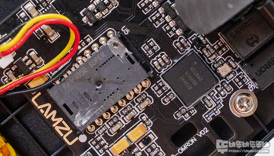 30,0000 DPI와 0.7/1/2mm LOD를 지원하는 픽셀아트 3950 센서와 Nordic 52840 MCU 모습도 확인할 수 있네요.