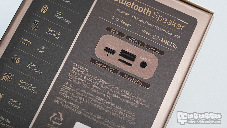 엔틱한 디자인을 잘 살린 BZ-MK330은 40mm 5W 출력의 듀얼 드라이버 유닛과 패시브 라디에이터를 적용으로 풍성한 사운드를 들려주며, 메모리를 이용한 MP3 재생, AUX in, FM 라디오, 블루투스 기능까지 지원하는 올인원 스피커에 진공관 느낌의 무드 조명 효과까지 더해져 분위기 연출에 최적화된 제품인데요.