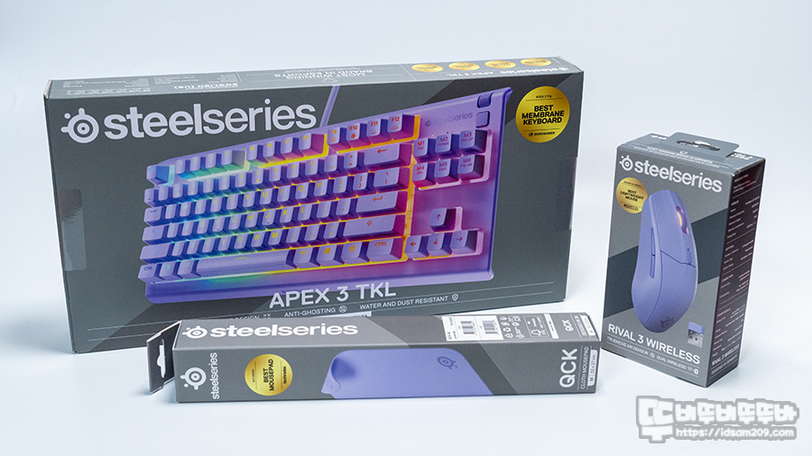 바로 스틸시리즈 Apex 3 TKL 저소음 키보드 + Rival 3 Gen 2 무선 마우스 + QcK M 마우스패드 (라벤더컬러) 세트입니다.