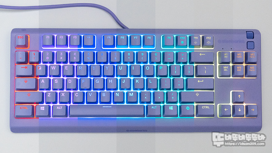 Apex 3 Tkl의 RGB 라이팅은 멤브레인 방식의 접점 필름 아래에 위치한 라이트 가이드 필름 구조를 통해 8개로 세분화된 라이팅 존을 통해 다이내믹한 LED 효과를 표현하는데 RGB 백라이트 광량이 생각보다 밝은 편이라 웬만한 키보드의 백라이트보다 만족스러운 편입니다.