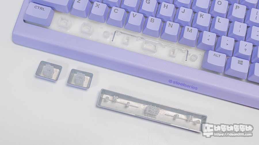 오리지널 멤브레인 구조로 되어 있으며 키캡이 고정되는 플레이트는 반투명 소재를 사용하여 RGB 백라이트가 잘 투과되고요.