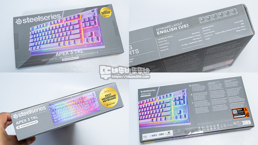 스틸시리즈 Apex 3 TKL 저소음 키보드 패키지는 제품의 이미지와 간략한 스펙 정보를 표현하고 있으며 정품인증 스티커와 보증기간 2년의 문구를 확인할 수 있습니다.
