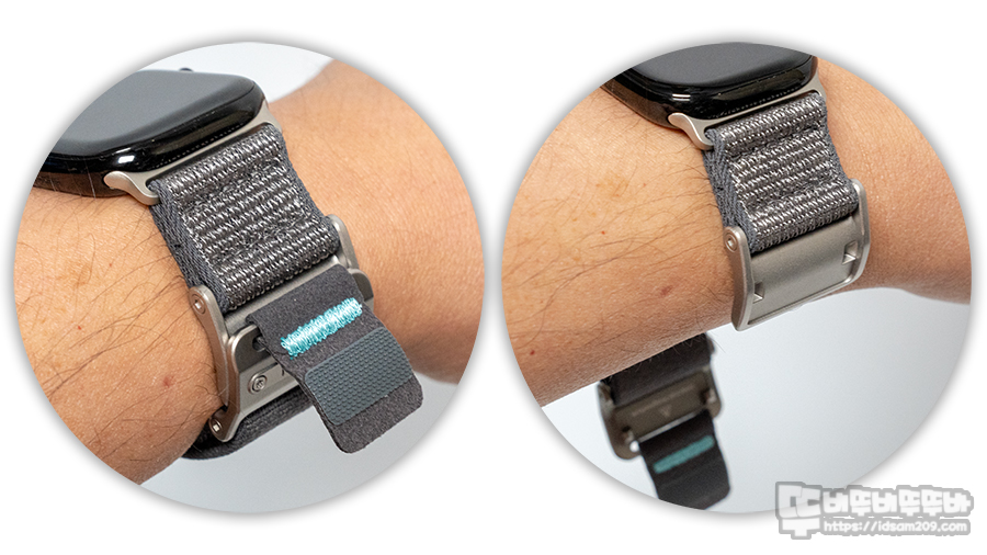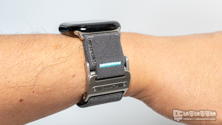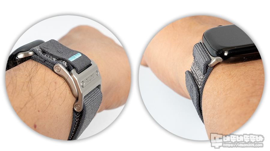 내구성이 뛰어난 316 스테인리스 스틸 버클은 부식과 녹이 없어 오래 사용이 가능하며 마그넷 버클과 벨크로의 이중으로 고정되는 퀵 릴리즈 방식으로 빠른 탈착과 착용이 가능여 밴드 길이 조절이 없어 사용할 수 있는 부분이 맘에 들었습니다.