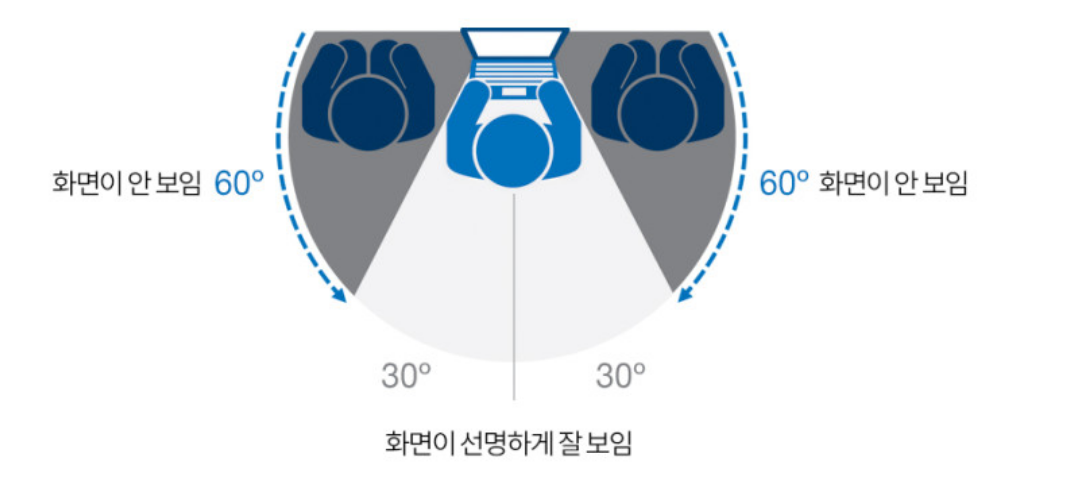 제품 설명을 참고하니 정면 기준 좌우 30도까지는 화면이 잘 보이고, 30도를 넘어가는 각도에서는 화면이 보이지 않는다고 합니다. 구입 시 이 시야각 정보를 참고하시면 좋을 것 같습니다.