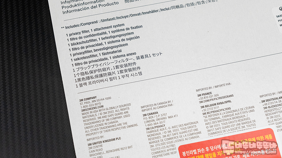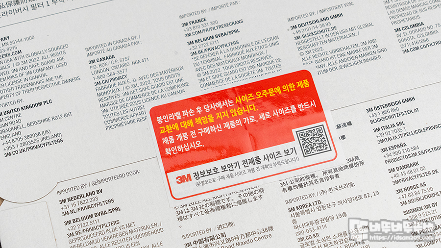 자동차 틴팅 필름에도 3M 로고가 있듯이, 정보 보호 필름 한쪽 구석에도 정품임을 알리는 3M 마크가 표시된 것을 확인할 수 있네요.