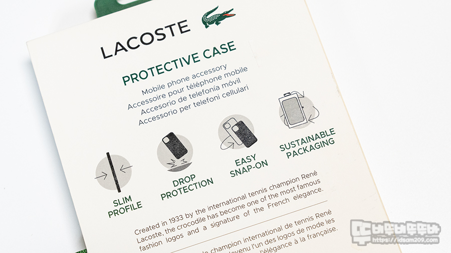 제품의 특징을 딱 봐도 슬림함, 낙하 보호, 간편한 장착, 재활용이 가능한 패키징 구성과 1933년으로 시작되는 테니스 챔피언 르네 라코스테가 만든 프랑스의 브랜드임을 강조하고 있습니다.