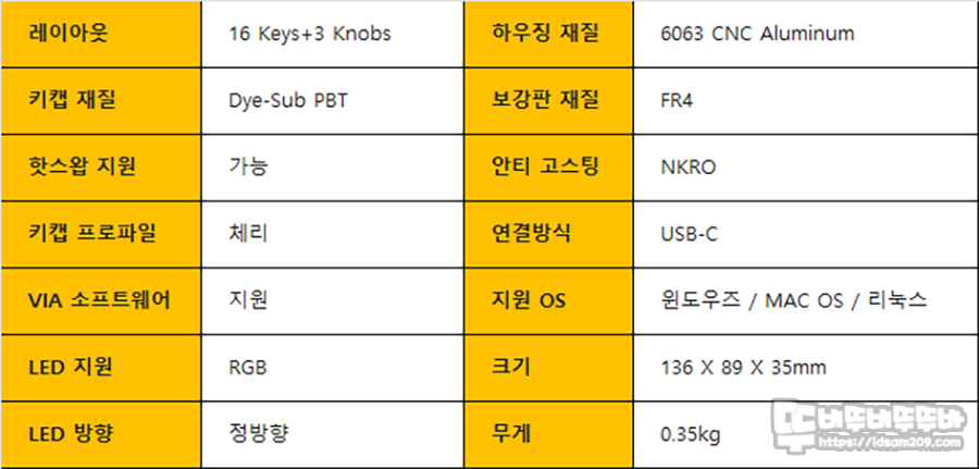 16 키 + 3 개 노브, CNC 가공 풀알루미늄 바디, Windows/MAC OS 지원, 키붐 Flick 리니어 스위치, 3/5핀 핫스왑 지원 및 정방향 기판, 온보드 메모리, RGB 설정, QMK/VIA 프로그래밍 및 매크로, 핫키 설정, NKRO 지원을 확인할 수 있습니다.