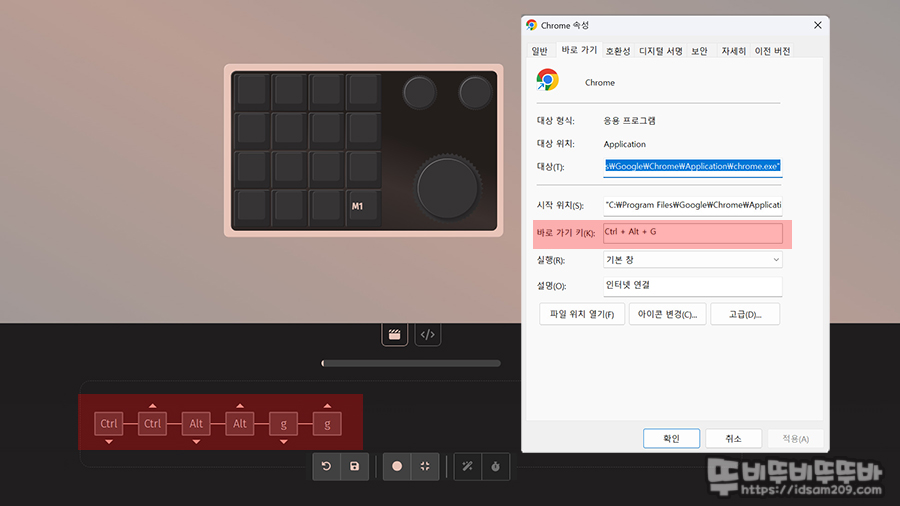 여기서 위 5번에 해당하는 단축키는 윈도우즈 기준 아이콘 속성에 들어가 "바로 가기 키(k)"를 활용하는 부분인데요.