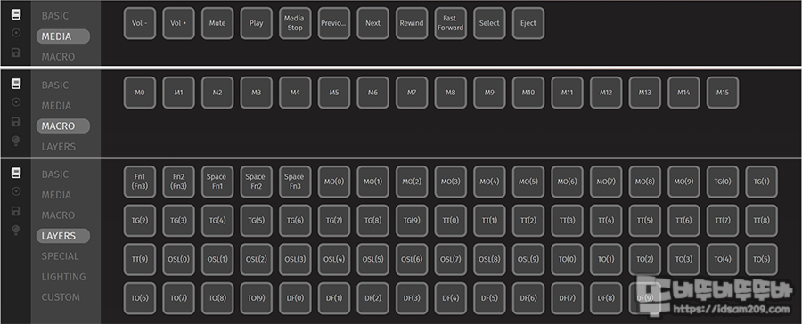 아래 메뉴에서는 키맵 / 매크로 / 저장 & 불러오기 / 라이팅 구성의 메인 메뉴와 Basic / Media / Macro / Layers / Special / Lighting / Custom의 키맵 세부 메뉴를 확인할 수 있습니다.