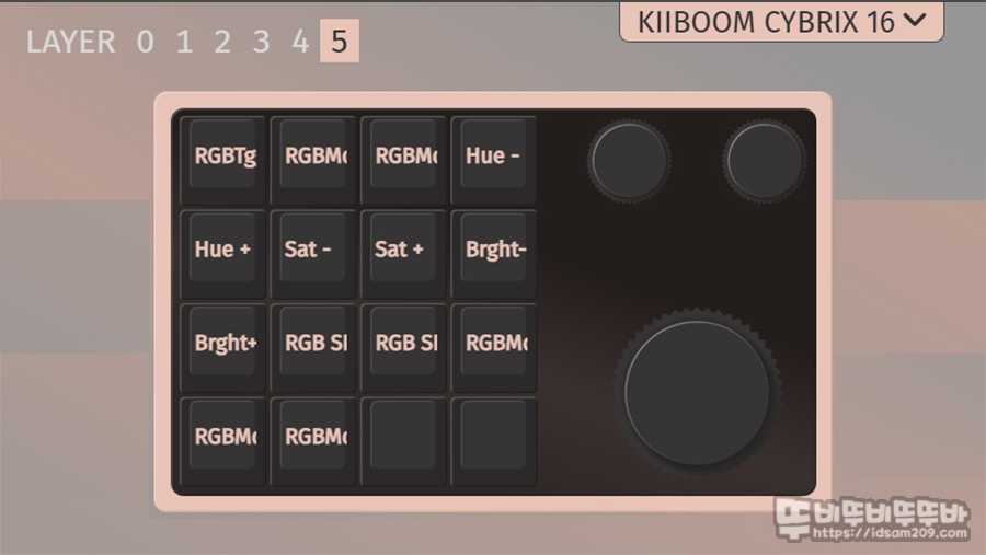 키붐 매크로 편집 패드 CYBRIX 16를 패키지에서 꺼내서 컴퓨터에 연결하면 LED 백라이트도 들어오지 않는 상태로 작동하는데 이유는 기본값이 0번 레이어 기능으로 설정되어 있기 때문입니다.