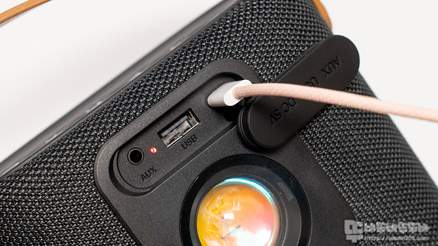 LED 상단에 실리콘 캡으로 덮여있는 포트 부분은 IPX4 생활 방수를 지원하며 포트 구성은 3.5mm AUX, LED 인디케이터, USB 메모리 단자, DC 5V USB-C 충전 단자로 구성되어 있습니다.