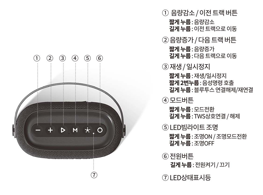 상단에 위치한 메인 컨트롤 구성은 큰 원형 디자인의 직관적인 도형이 각인된 버튼 방식으로 +, - 버튼은 짧게 볼륨, 길게 트랙이동, ▶ 버튼은 재생, 일시정지, M 버튼은 입력 모드 변경, LED 무드등 버튼은 짧게 LED On/효과 변경, 길게 LED Off, 그리고 전원 버튼으로 구성되어 있습니다.
