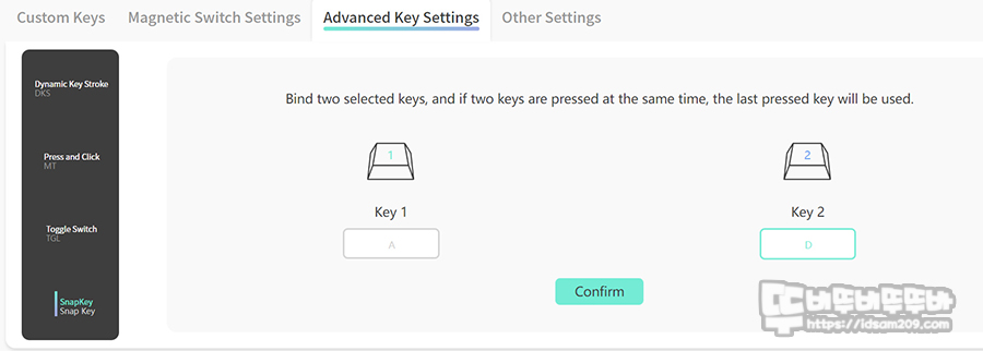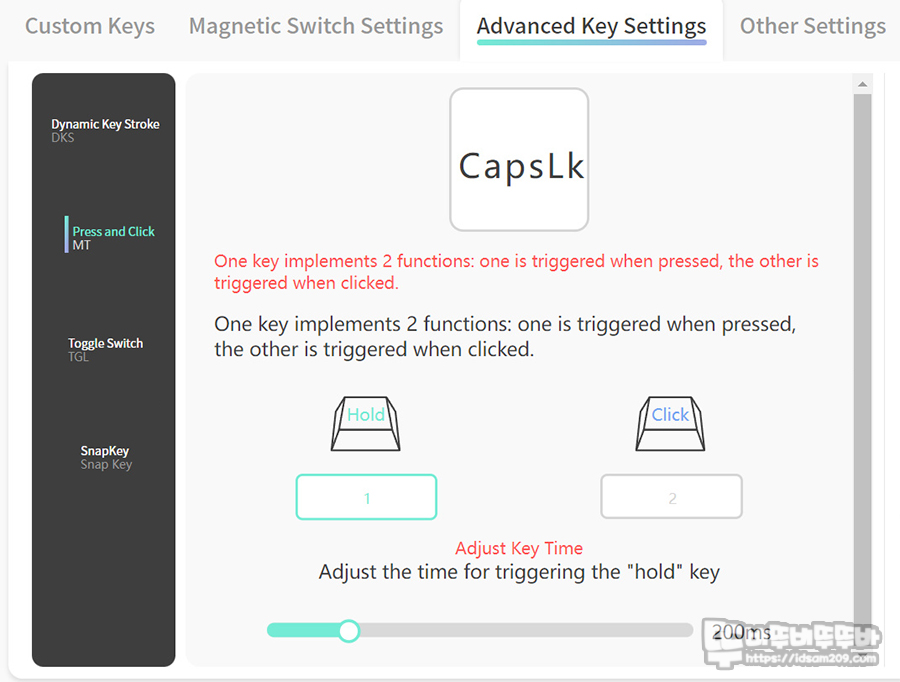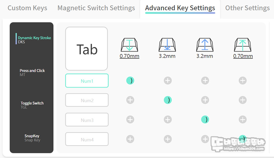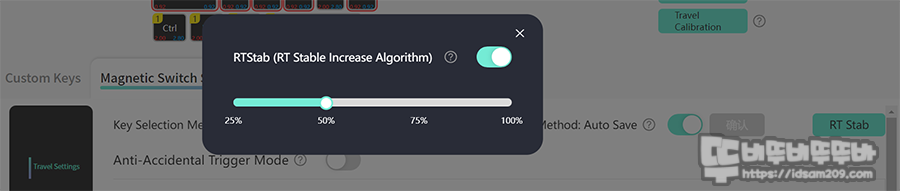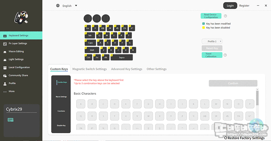 전용 소프트웨어는 키 커스터마이징, 매크로, Fn 레이어, 매크로, LED 백라이팅, 프로파일 등의 메뉴로 구성어 있으며, 키 커스터마이징 메뉴에 자석축의 래피드 트리거, SOCD, USB 폴링 레이트 등을 설정할 수 있게 구성되어 있습니다.