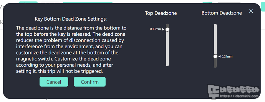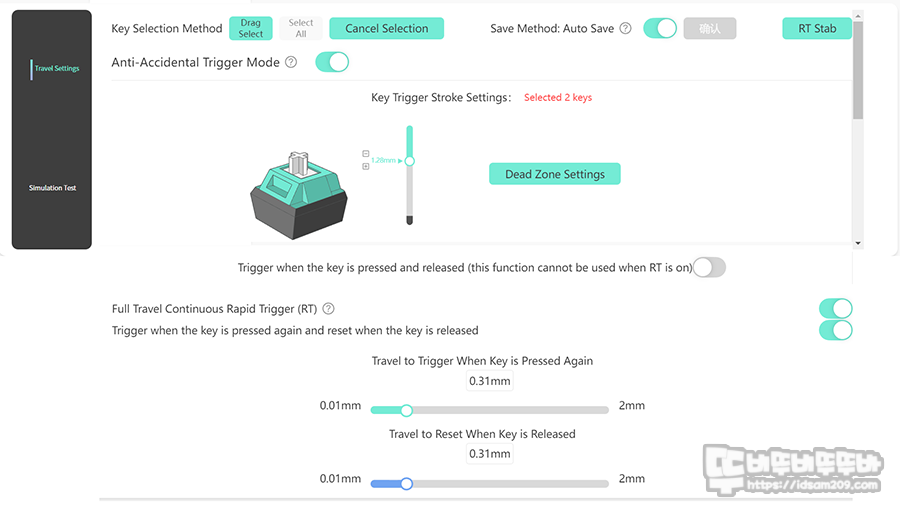 위의 내용과 같이 RT 옵션을 켜지 않으면 0.1mm ~ 3.30mm 스위치 입력 거리 범위 내에서 입력 지점 선택과 해제 지점 선택이 가능하며, 해제 지점 설정은 RT 옵션이 활성화되지 않은 상태에서 해제 지정 기능을 활성화해야 가능합니다.