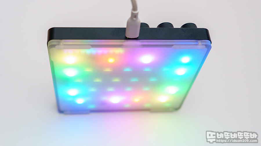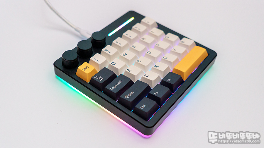 키붐 KiiBOOM Cybrix 29 모습을 살펴보면 상단에 3개의 노브, Fn 펑션을 제외한 문자열로 구성된 29 키와 상단에 LED 라이트 바와 하판의 언더 글로우 LED 라이팅을 지원하는 디자인을 확인할 수 있습니다.