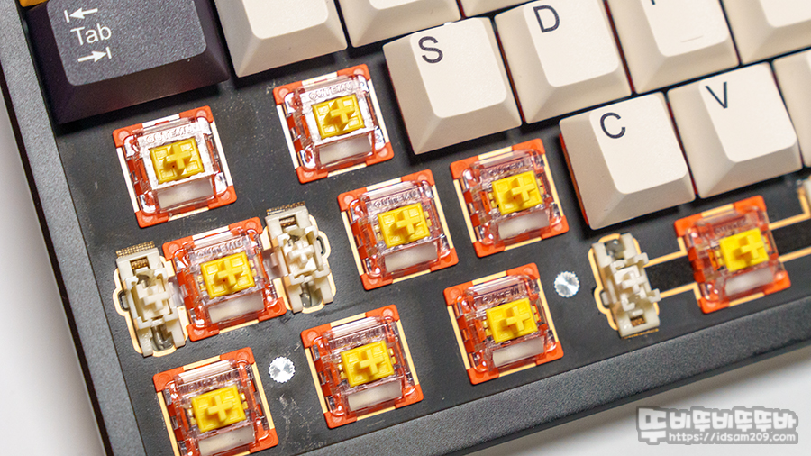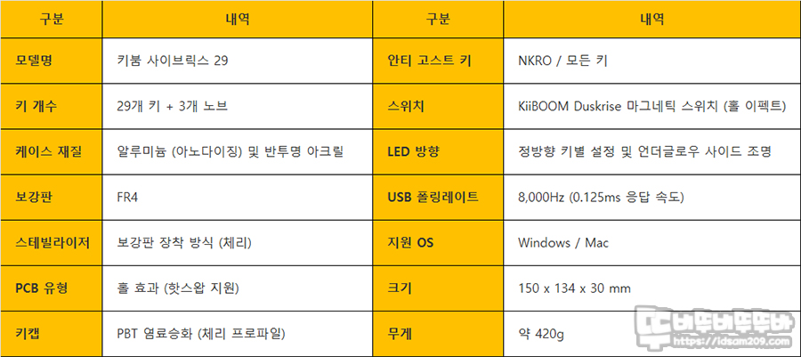 키붐 KiiBOOM Cybrix 29 키보드는 FR4 보강판, 보강판용 체리방식의 스태빌라이저, 총 이동거리 3.5mm, 45g 키압의 KiiBOOM Duskrise Switches가 적용된 것을 확인할 수 있네요.