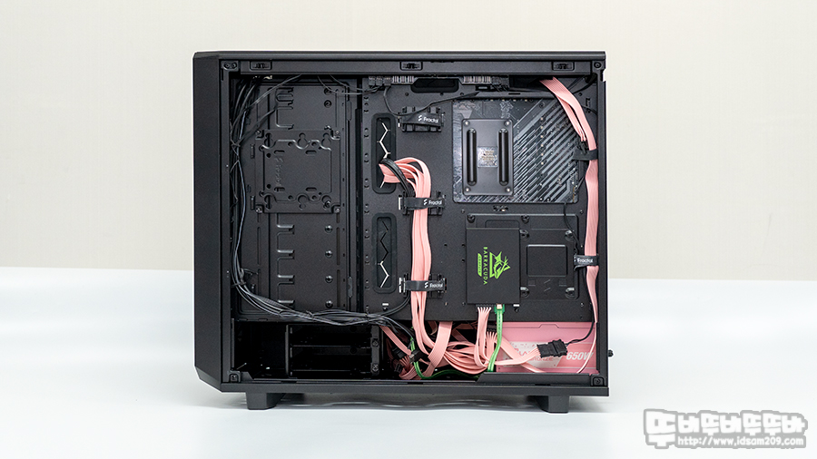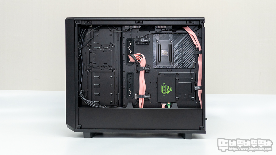 케이스 중앙과 끝 부분에 기본 장착된 케이블 가이드 덕에 깔끔한 케이블 정리가 가능했으며 하단 챔버 부분의 커버를 이용하면 케이스 하단에 지저분하게 보이는 케이블들이 깔끔하게 보이이게 됩니다.