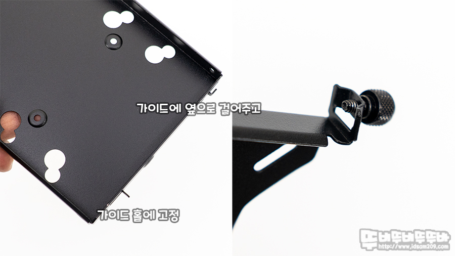 샤시 안쪽 챔버 부분의 커버와 샤시에 부착된 이동식 벽인 서버 빌드 용 HDD 가이드에 가림막으로 덮여있는 플라스틱 커버를 분리 후 HDD 가이드를 앞쪽으로 이동시켜 전면과 상단 그리고 챔버 경계면에 고정나사를 채결 후 범용 가이드를 연결하게 됩니다.