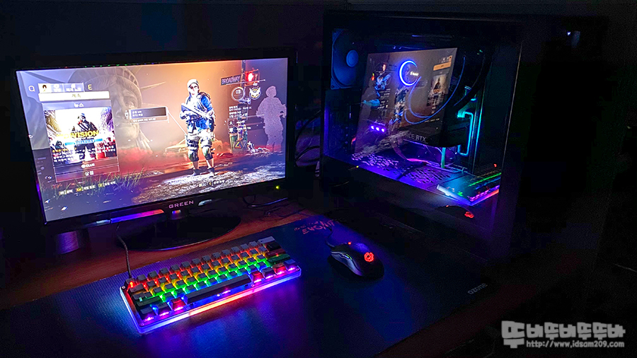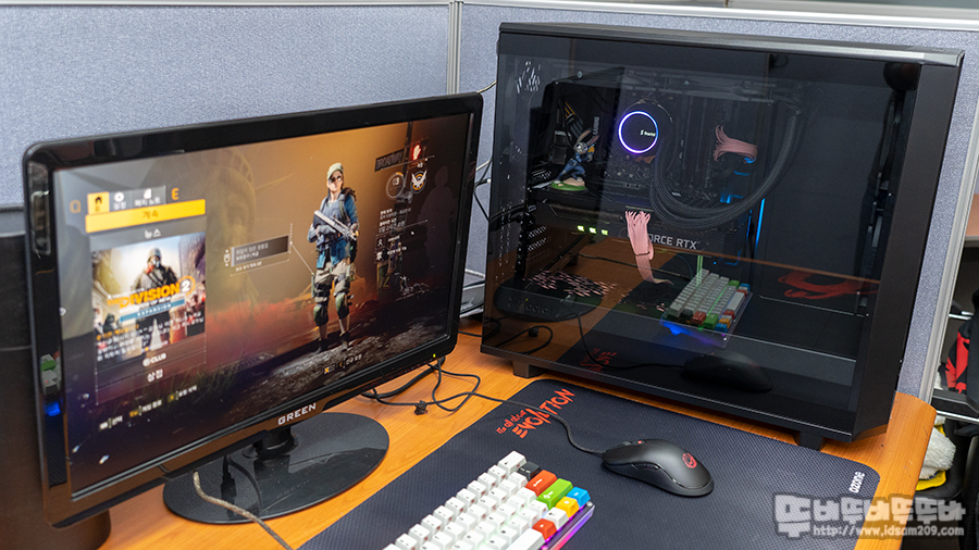 최신 그래픽카드 장착 시 어떤 느낌일까? 하는 생각이 들었는데 3070 그래픽카드의 길이가 294mm라 그런지 케이스 사이즈에 비해 짧아 보이네요.