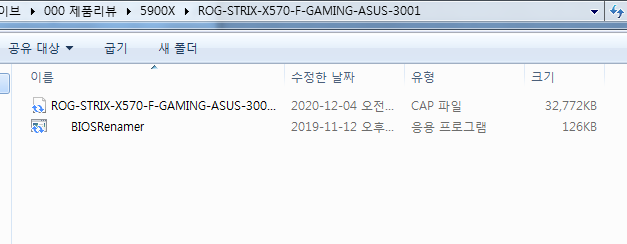 장문의 ROG-STRIX-X570-F-GAMING-ASUS-3001.CAP 파일을 BIOS Renamer를 이용하여 파일 이름 변경을 해줍니다.