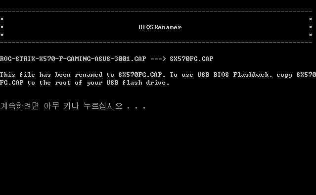 BIOS Renamer 실행하면 ROG-STRIX-X570-F-GAMING-ASUS-3001.CAP → SX570FG.CAP 파일 이름이 변경된 것을 확인할 수 있는데요. 변경된 파일을 USB에 복사해주세요.