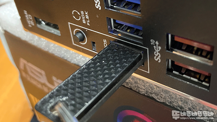 메인보드 백플레이트 하단에 BIOS FLBK 네모칸 USB 포트에 바이오스 파일이 들어있는 USB을 꼽아주고 버튼을 눌러줍니다.