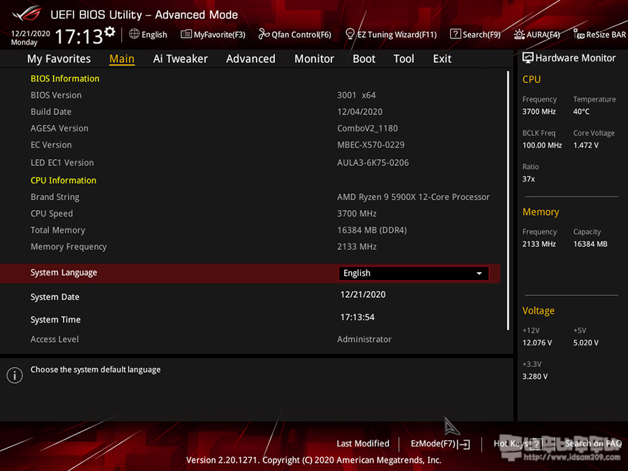 이후 바이어스가 정상적으로 업데이트되어 5900X CPU가 인식된 모습니다.