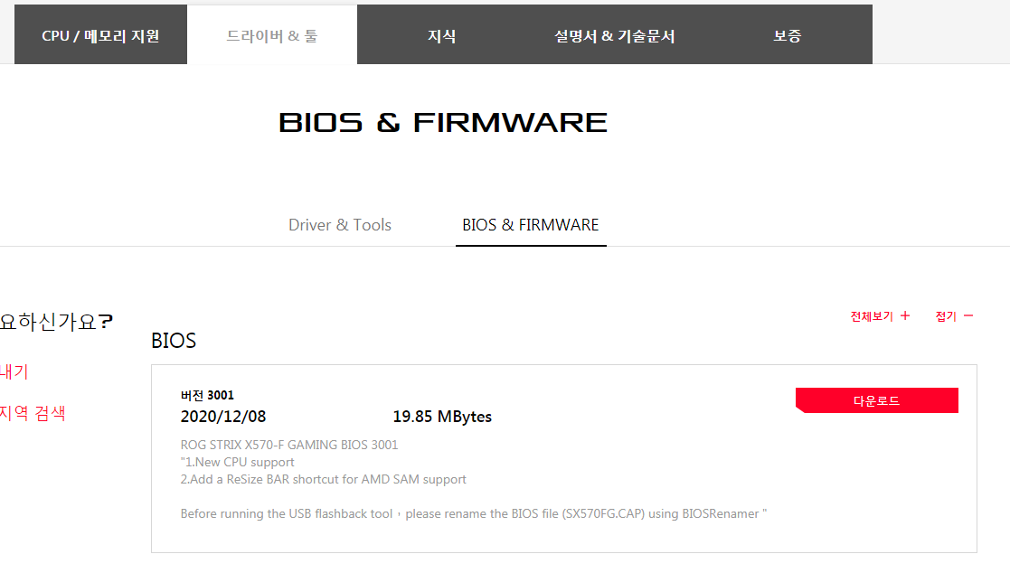 ASUS 사이트에 접속하여 최신 바이오스를 다운로드합니다.