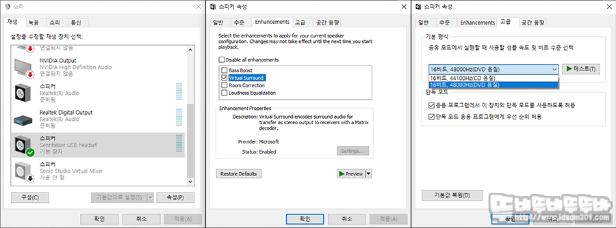 사운드 속성에서 가상 7.1 채널 선택도 가능했지만.... 그다지 의미는 없으니 참고하시기 바랍니다.