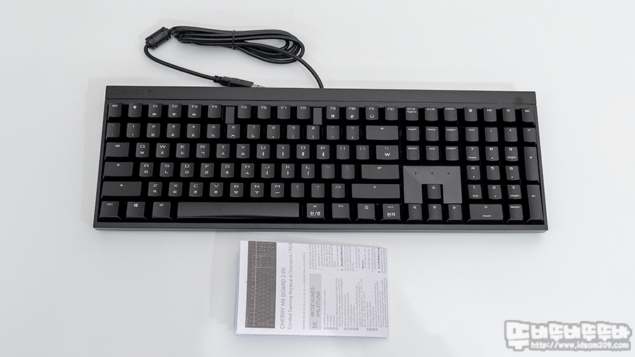 제품 구성은 체리 MX BOARD 2.0S 무보강 기계식 키보드 본체와 사용 설명서로 구성되어있습니다.