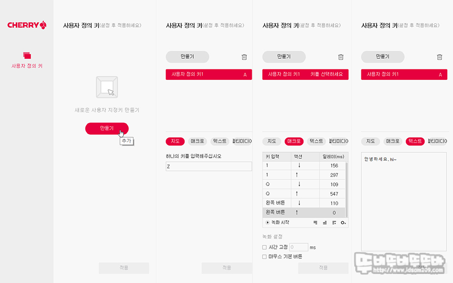 체리 키보드는 레이어를 지원하지 않기에 키 매크로 또는 텍스트 매크로 입력 시 문자 입력이나 게임 플레이 시 간섭이 없는 키패드에 부여하는 게 좋으니 참고하시기 바랍니다.