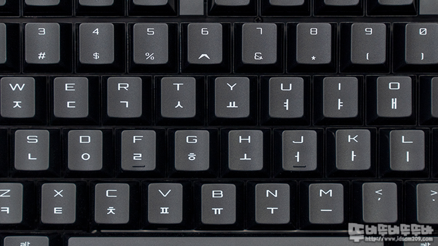 레이저로 각인된 폰트는 영문과 한글이 세로로 배열되어있으며 F 키와 J 키는 손가락 위치를 구분하는 돌기가 적용되어있습니다.