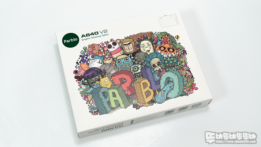파블로 A640 V2 패키지는 타블렛을 그린 거 같은 느낌의 캐릭터와 PARBLO로고를 썩어 귀엽게 표현하고 있습니다.