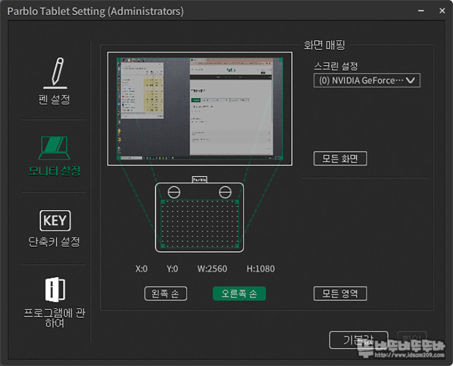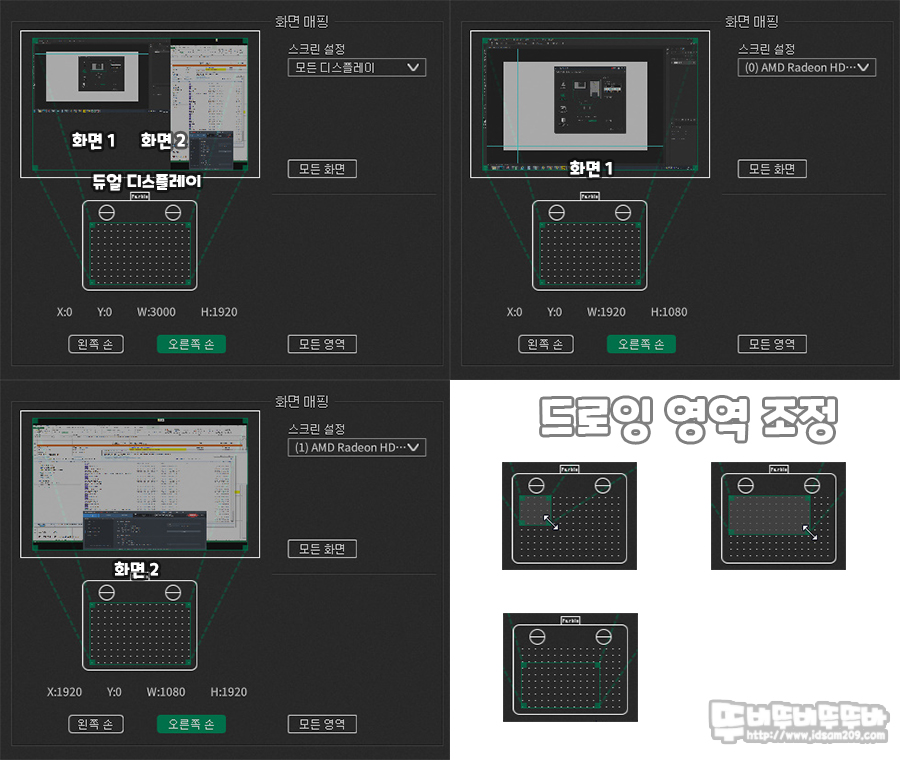 싱글 모니터에서는 드로잉 영역만 조정하여 사용하게 되겠지만 듀얼 모니터 사용 시 모니터 영역을 메인, 세컨드 선택 또는 전체로 선택하여 사용이 가능하며 타블렛 사용에 적응이 되면 드로잉 영역을 조정하여 편리하게 사용할 수 있습니다.