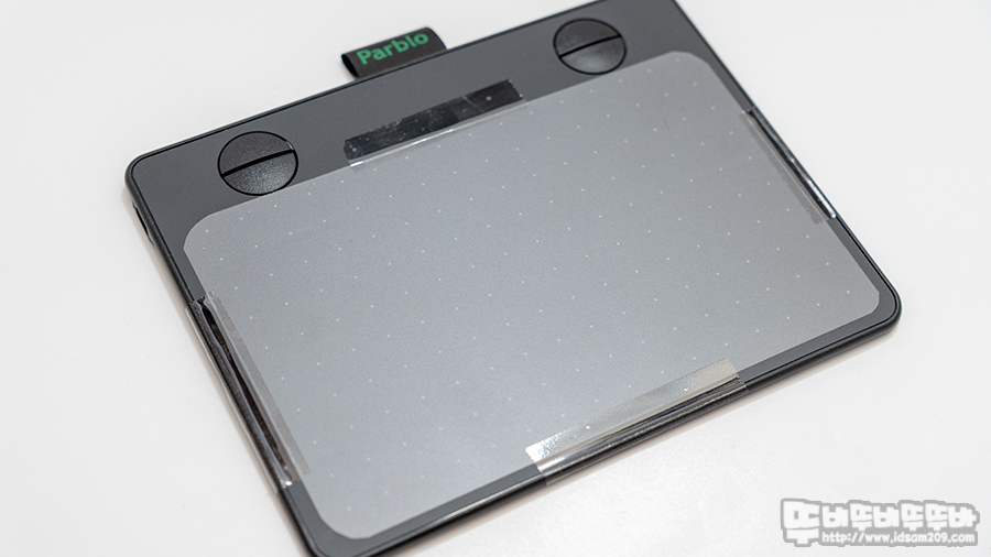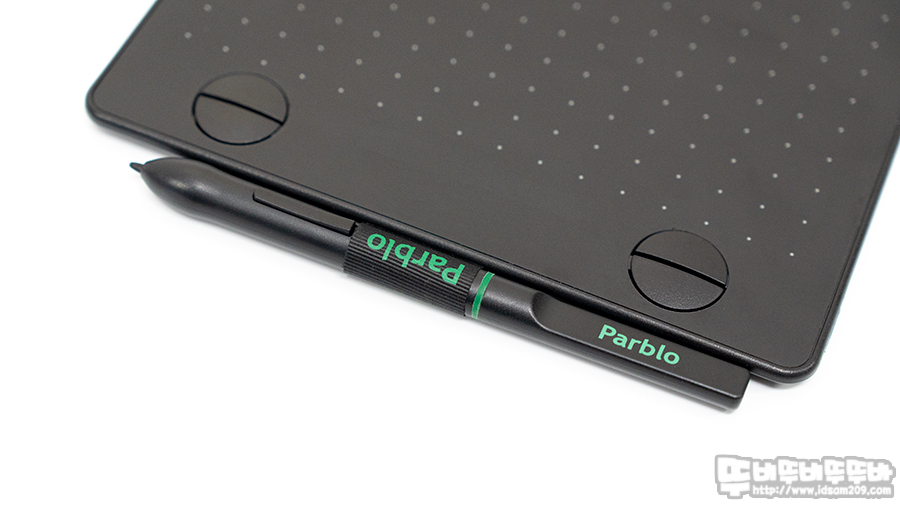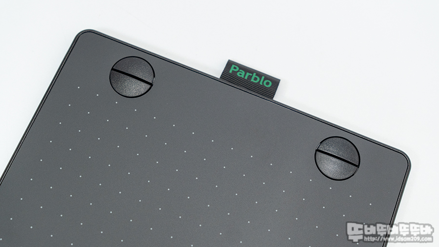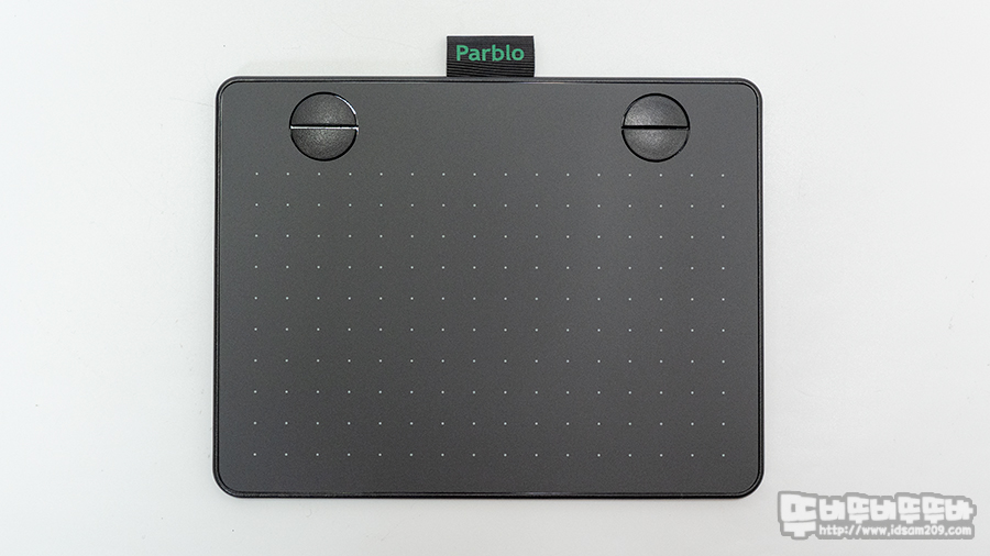 상단에 Parblo 로고가 인쇄된 나일론 고리는 무선 펜을 꼽아서 휴대할 수 있게 지원하며 반원으로 구성된 4개의 기능 버튼은 개구리 눈처럼 도드라져 보이는 게 특징입니다.