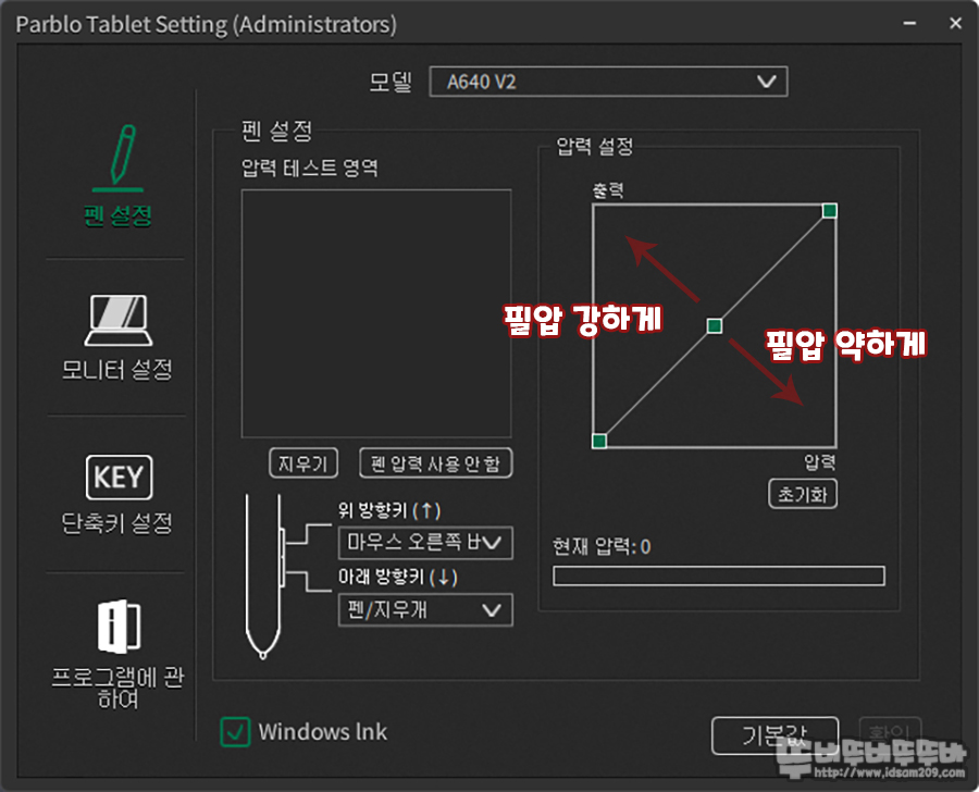 펜 설정에서는 펜 버튼에 기능 변경, 필압 그래프를 통한 필압 강도 조절을 지원합니다.