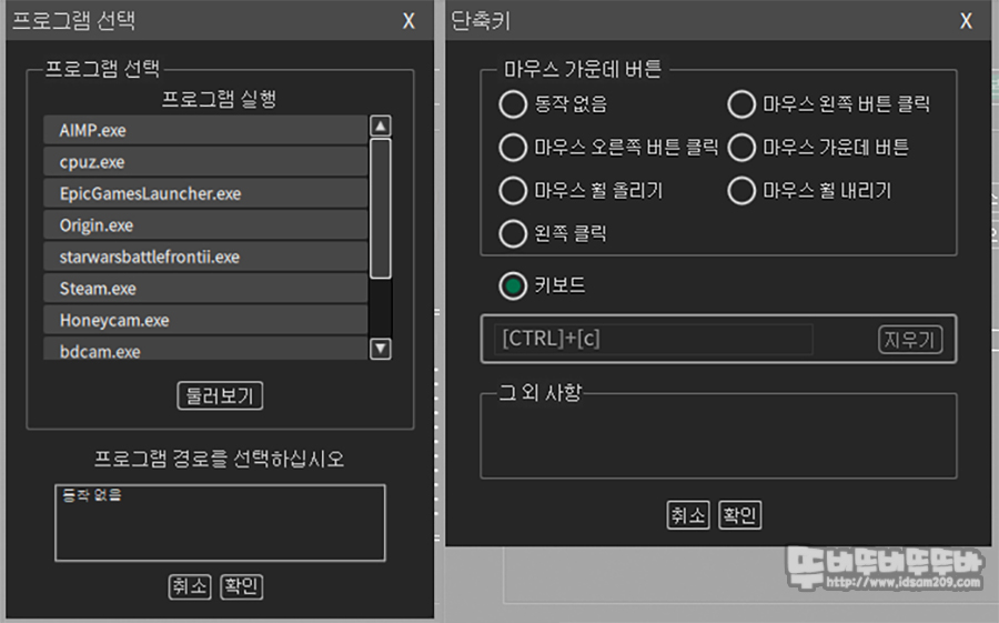 각 버튼의 메뉴 선택 시 기본 기능 이외 프로그램과 단축키를 지정할 수 있는 메뉴로 구성되어 있어 필요에 따라 활용하시면 좋습니다.