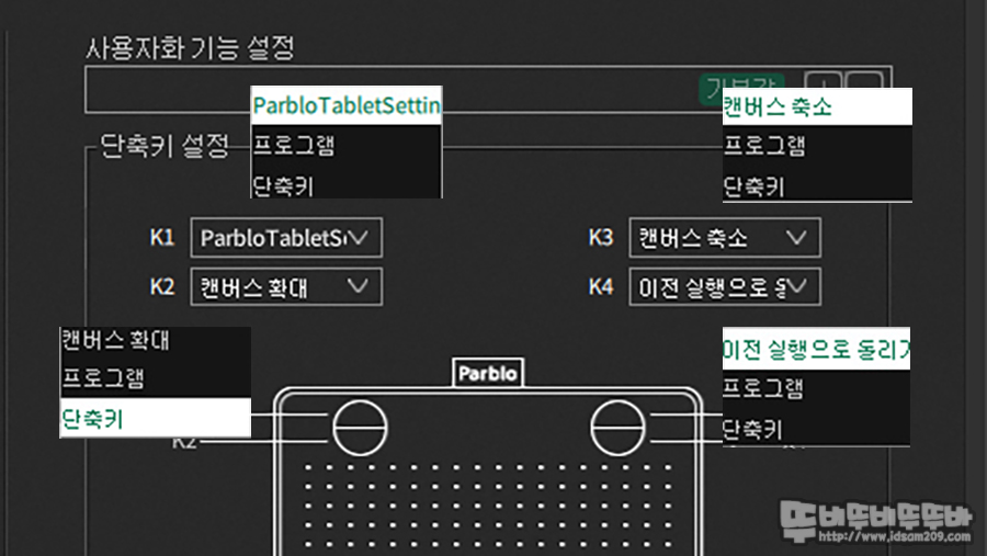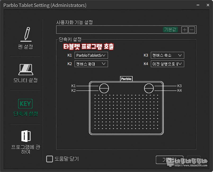 타블렛 상단의 4개의 버튼에는 위와 같은 기능이 기본적으로 부여되어있습니다.