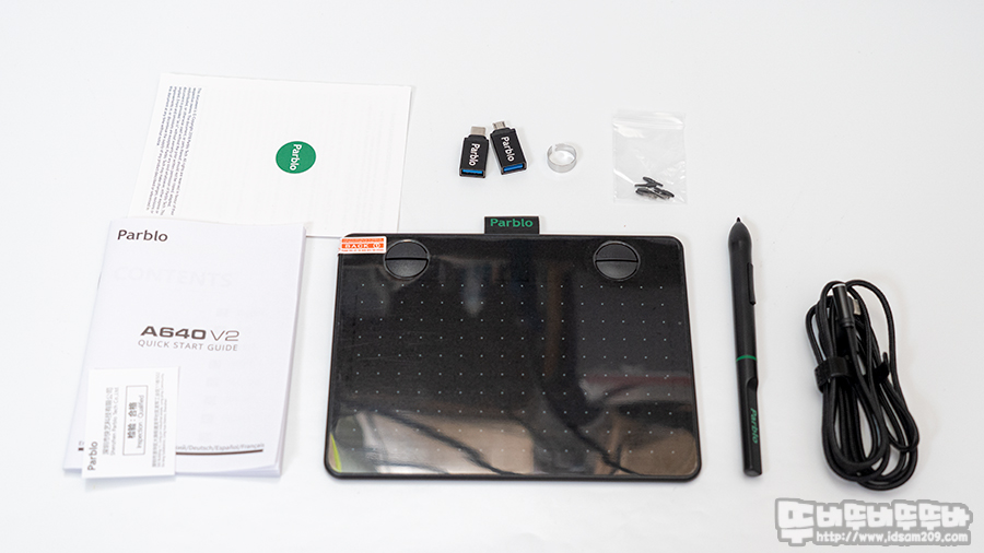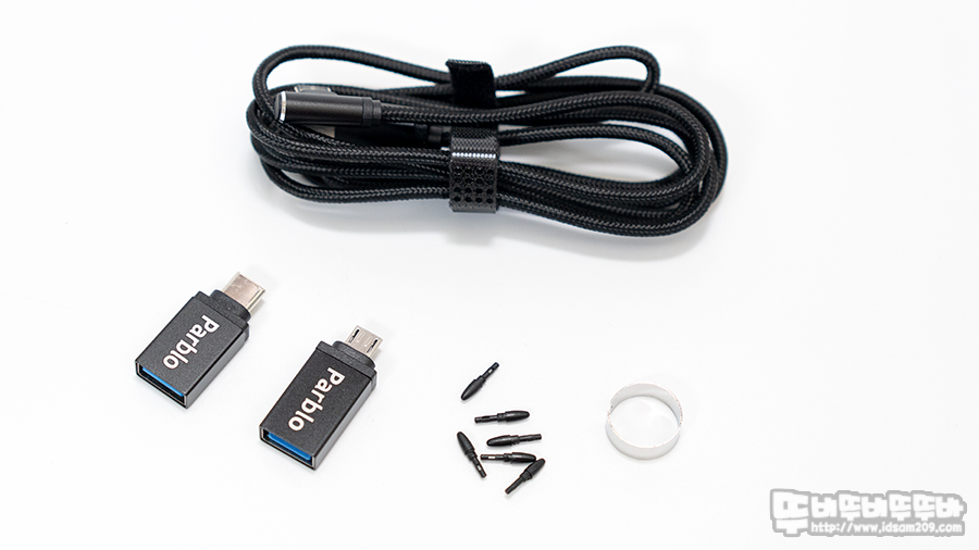 제품의 구성은 사용 설명서와 안드로이드 스마트 기기 연결을 지원하는 USB-C, MicroUSB OTG젠더, 펜촉 제거 클립, 여분의 펜촉, 타블렛 본체, 무선 펜, USB-C to USB-C PC 연결 케이블로 구성되어있습니다.