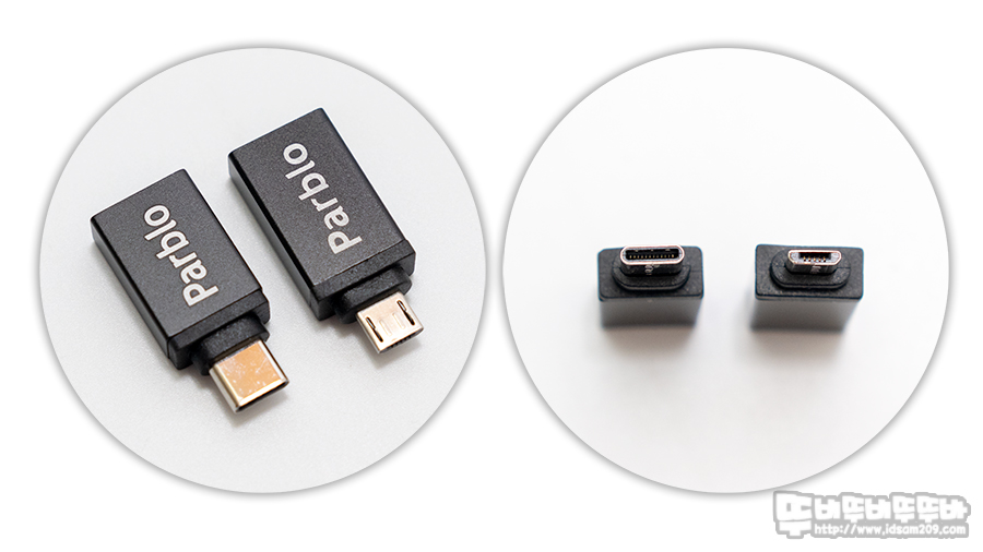 기본 USB-C to USB-A 케이블과 안드로이드 디바이스용 USB-C, MicroUSB OTG 젠더를 이용하면 안드로이드 스마트 기기에서도 활용이 가능합니다.