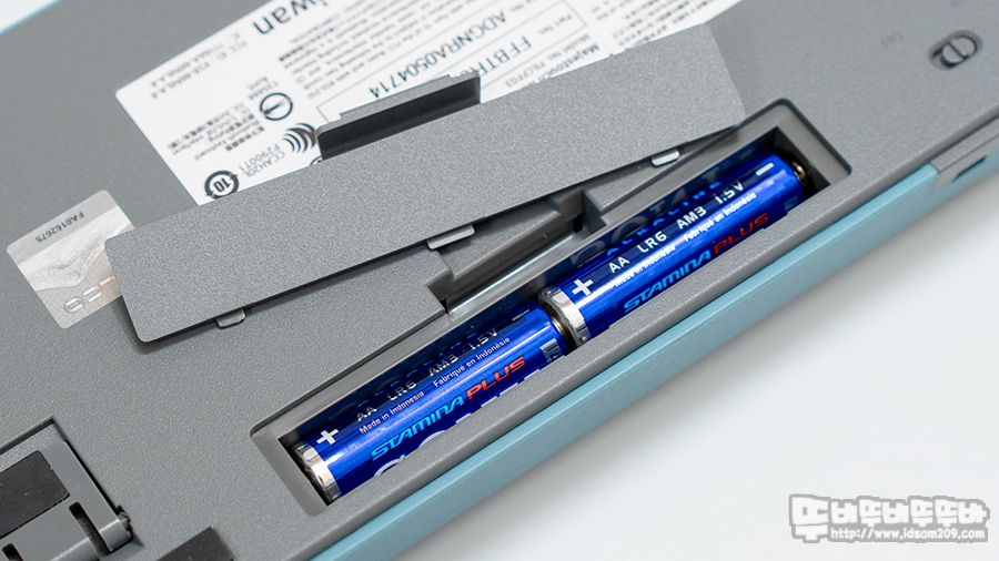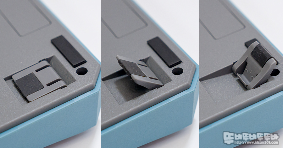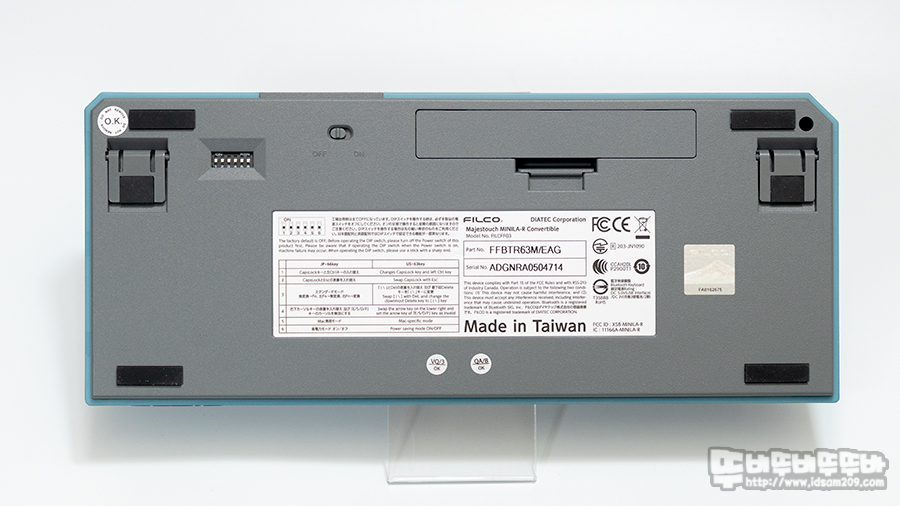 필코 마제스터치 MINILA-R Convertible 블루투스 키보드 바닥 면에는 높이 조절 다리, 키 배열 변경을 위한 DIP 스위치, AA 건전지 소켓으로 구성되었으며 높이 조절 다리에는 실리콘 소재의 미끄럼 방지 캡이 부착되어있어 키보드 사용 시 밀림을 방지하고 있습니다.