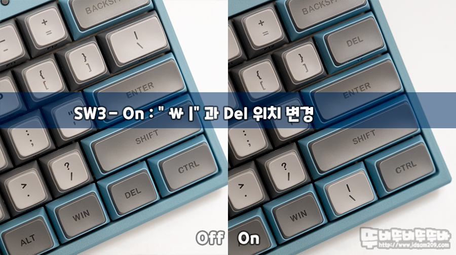스위치 3번을 On으로 설정 시 \/| 키와 DEL 위치 변경되며 Fn + \/| 조합으로 사용했던 Del 키를 그냥 눌러서 사용할 수 있게 변경됩니다.