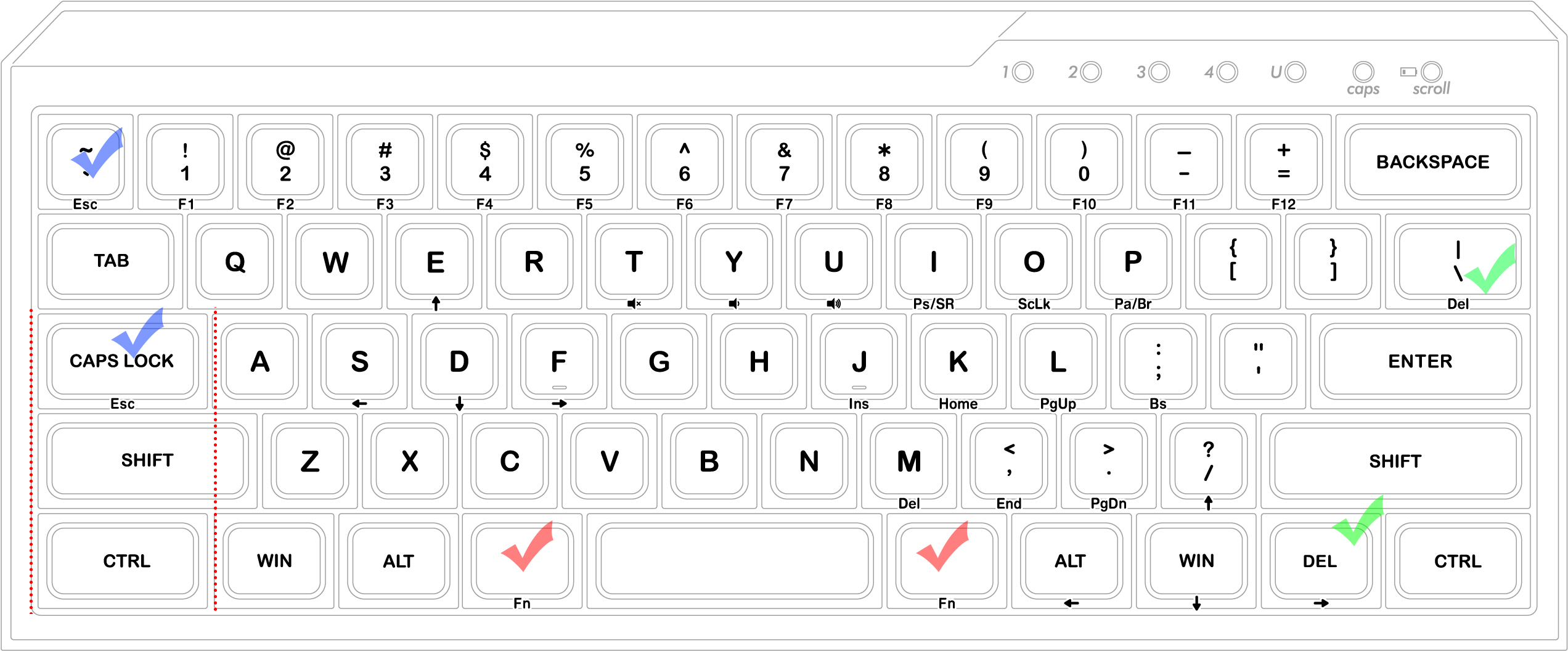 63 키의 레이아웃을 살펴보면 Esc, Del, Fn 키가 2개씩 구성되어있어 직접 또는 Fn 조합으로 사용할 수 있게 디자인되어 있는데 몇 가지 특징을 살펴보면...